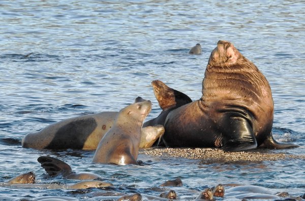 De laatste verrassing van vandaag is een grote kolonie Steller zeeleeuwen die op een overbevolkt eiland liggen en ruzie maken en voor het eiland in groepjes door het water buitelen alsof ze met een circusact bezig zijn. Het oorverdovende geluid van het eiland werkt op je lachspieren. Het is een boel gegrom en gebrul met af en toe langgerekte ahhhs en ohhhs. Het is volstrekt duidelijk wie de baas is. Vooraan zit een enorme man, groter dan wie ook. Hij zit rechtop op zijn voorflippers heel, heel macho te wezen. Rondom hem heen is het gehakketak en gegrom het heftigst, maar enkele bevoorrechte vrouwtjes mogen zich in zijn gunst verheugen en zich tegen hem aan vlijen. Zo goed en zo langdurig hebben we dit nog nooit gezien.