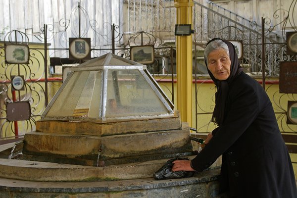 Op advies van David maken we onderweg een stop in Surami. Vroeger in de Russische tijd een geliefd en druk bezocht kuuroord, maar nu een fraai voorbeeld van vergane glorie. Je kan er genezen van hartkwalen, de lucht is er zuiver, maar het allerbeste van Surami is het heilzame bronwater. In het dorp staat een fontein met veel kranen waaruit het water overvloedig stroomt. De stenen bak waarin het water stroomt, is roze aangeslagen door de mineralen in het water (dat hebben we al eerder op een natuurlijke plek gezien). Rondom de fontein is een mooi rond prieeltje gebouwd met aan de wanden flets geworden foto's van de gloriedagen van weleer. De lokale bewoners houden hun bron in ere en komen aan de lopende band water tappen bij de bron. Een oude vrouw vult haar grote fles voor zover dat gaat bij de kraan. Als dat niet meer lukt – de fles is te groot – vult ze de rest van de fles door steeds de dop van de fles met water te vullen en dat in de fles te gieten. Daar moet je geduld voor hebben. Het heilzame water is goed voor je ogen, maar ook goed voor je ingewanden. Wij proberen het water toch maar niet, uit vrees dat onze ingewanden er in een te hoog tempo door worden schoongespoeld. Wij houden het deze reis maar op gebotteld mineraal water.