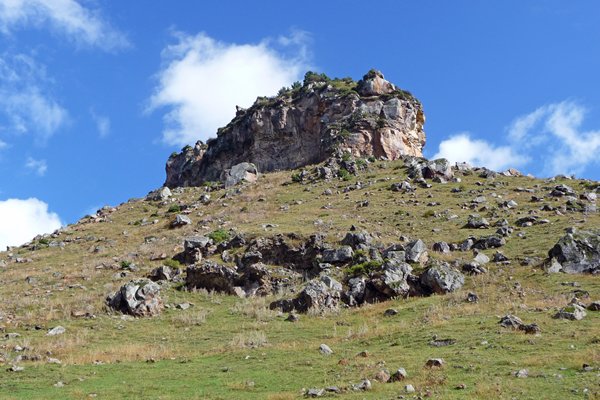De laatste ochtend in Kazbegi zetten we de wekker weer vroeg om de zonsopkomst over de berg te bewonderen. Gisteren was die prachtig, maar vandaag is het bewolkt en zien we niets. Het heeft afgelopen nacht flink geregend en ook als we vertrekken regent het. De neerslag zie je ook gelijk in het landschap terug. De rivier is een flink stuk breder en bruin van het meegevoerde slib. De waterval waar we heen wandelen is een forse waterval die gisteren nog kleiner was. Hebben wij regen, boven op de bergen zien we overal om ons heen een mooi laagje verse sneeuw liggen. We rijden terug tot we weer bijna in Mtskheta zijn en slaan dan af om door de brede vallei van de Mtkvari rivier richting Gori te rijden. Het is een vruchtbare vlakte, die er wel droog uitziet, maar er groeit nu nog kool en maïs, we zien wijngaarden en appelboomgaarden vol appels.
