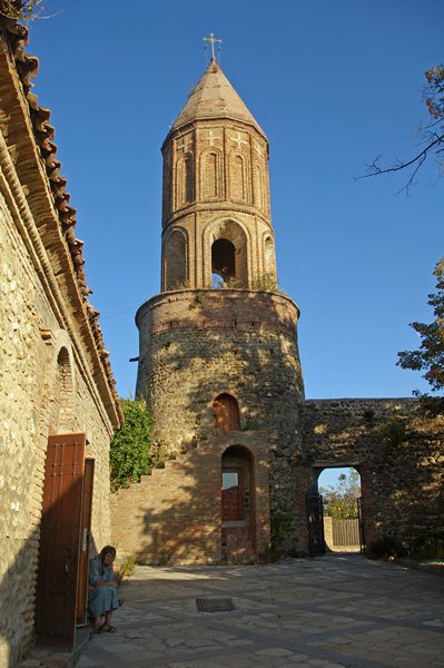 We gaan eerst nog naar het Bodbe klooster, gewijd aan St. Nino die hier begraven ligt. Er staat een prachtige stenen kerk met klokkentoren. De kerk is van binnen helemaal beschilderd, maar helaas mogen we niet fotograferen. De fresco's aan het plafond zijn al helemaal vervangen, die op de muren zijn nog oud. Bij het Bodbe klooster is een heilige bron, maar daar moet je wel wat voor over hebben: 758 treden naar beneden en later weer naar boven. Bij de heilige bron kan je niet alleen water halen, je kan er ook baden. Je krijgt dan een wit hemd aan en geneest van alle kwalen die je hebt of denkt te hebben. Rik merkt op dat ze de douche beter bovenaan de trap hadden kunnen maken.