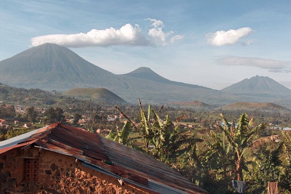 Foto: uitzicht op de drie vulkanen van Mgahinga; v.l.n.r. Mt. Sabinyo, Mt. Gahinga en Mt. Muhavura.