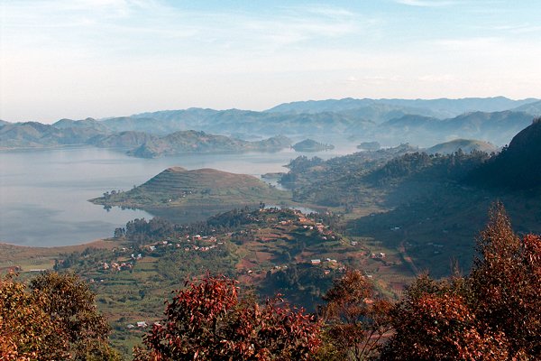 Het meer is erg mooi. Onderweg zien we veel akkertjes met bonen, aardappels, maïs, cassave, bananen, koffie en sorghum (voor het bier).