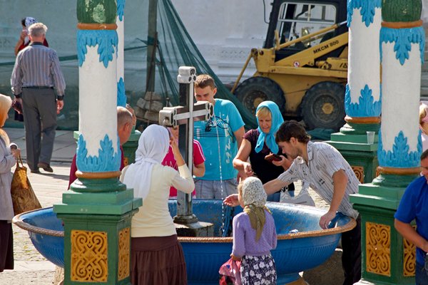 In de Sergievkerk met prachtige gouden koepels, staat de tombe van Sergiev, een belangrijke bedevaartsplek. Mensen schuifelen in een lange rij langs de tombe en buigen zich diep over Sergiev's resten heen om de tombe te kussen. Kinderen worden opgetild zodat ook zij de tombe goed midden op kunnen kussen. Een enkeling valt voor de tombe op zijn knieƫn. Hier wordt oprecht geloofd.