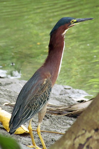 In Manuel Antonio gaan we nog even met de bus naar het strand. De bus rijdt zeer frequent en kost bijna niets. Achter het strand is een leuk poeltje met aan de overkant mangrovebos. We zien een prachtige groene reiger (green heron) en piepkleine visjes die met scholen tegelijk over het water springen. Vanwege de dreigende lucht slaan we de toeristendrukte in zijn geheel over. Terecht, want de eerste spatjes vallen als we uit de bus stappen en als we eenmaal binnen zijn, barst een flinke bui los.