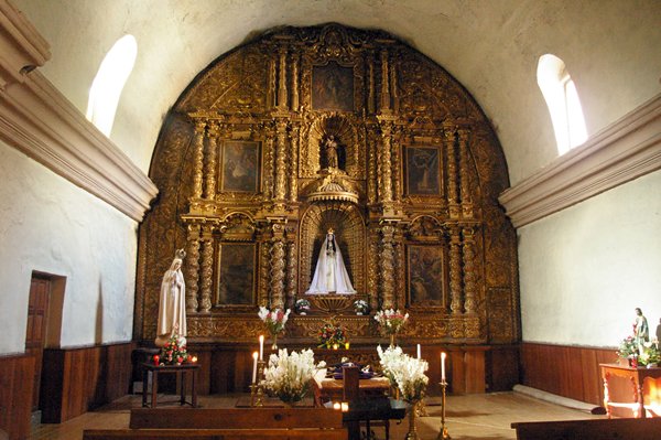 Foto: interieur van de kerk met de rijke bladgoud versiering.