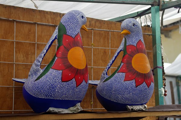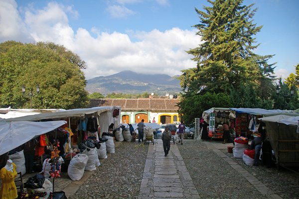 De kerk staat aan de toeristenmarkt waar ze volstrekt andere dingen hebben dan in Guatemala. Vooral de geborduurde bloesjes zijn erg mooi. Op het plein zien we een groep prachtig geklede mannen en vrouwen. Die moeten voor iets speciaals gekleed zijn, want je ziet hier weinig traditionele kleding.