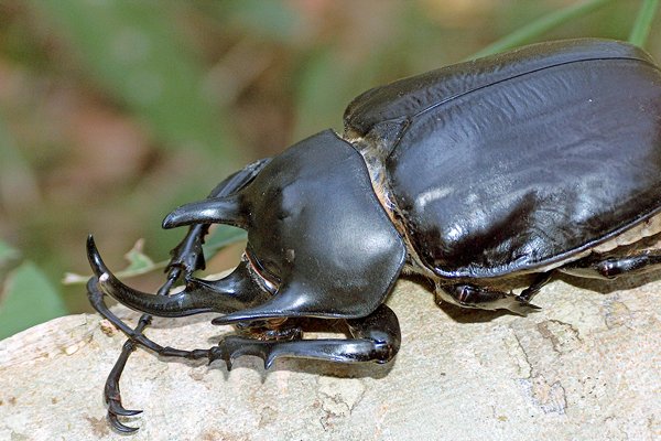 We zien een prachtige specht met een vuurrode kop, en een 8 cm heel grote, heel zwarte neushoornkever van 8 cm, met een hoorn van 1,5 - 2 cm. De kever is dood. Eerlijk gezegd vind ik het niet heel erg dat hij niet meer opeens weg kan vliegen.