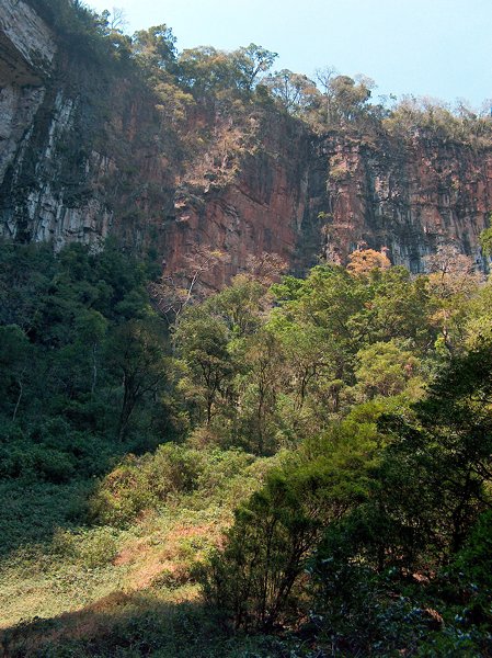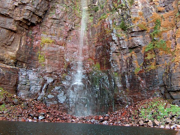 De waterval valt helemaal vanaf boven, vanaf de 400 meter hoge meseta, steil naar beneden. De meseta loopt loodrecht af, over een hoogte van zo’n 150 meter. De waterval die vanwege het droge seizoen maar klein is, wordt door de wind weggeblazen en waait als een regengordijn over de rotswand. Hij komt uit in het kleine meer, dat uitmondt in de rivier.