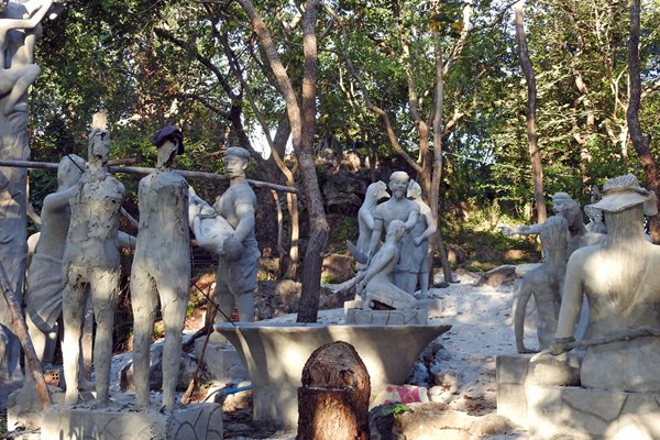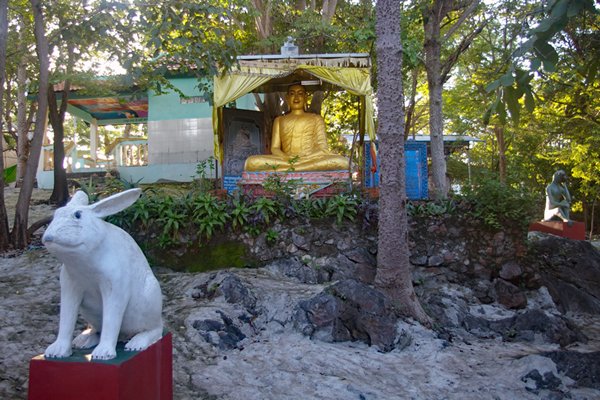 's Middags laat gaan we nog naar de Killing Caves, een door de Rode Khmer gebruikte grot om slachtoffers in te dumpen. Nu zie je in de grot vooral kleine altaartjes. Rondom de grot zijn grote tempels en enorme beeldengroepen. De grot is op een berg. Cambodja is eigenlijk in zijn geheel vlak, maar aan de grenzen zijn bergen en deze berg is eigenlijk een beginnetje van de bergen in het grensgebied met Thailand. Bovenop de berg is een uitzichtpunt en opnieuw een tempel. Rondom de tempel wemelt het van de makaken, waarvan er veel met een jonkie rondsjouwen. Ze weten duidelijk dat ze hier niets te vrezen hebben.