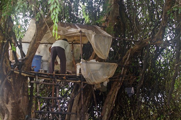 Met de nieuwe boot varen we naar het uitzichtplatform waar een ranger woont. Iedereen zal zich daar een voorstelling van maken, maar geloof me, die klopt niet. Via een bamboeladder kom je bij de hut van de ranger. Hut is teveel gezegd. De ranger woont in een boom en heeft een platform van 2 bij 2 meter, van boven en aan twee zijkanten afgedekt met een stuk plastic. Daar woont hij gedurende twee weken totdat hij afgelost wordt. Vanaf het 'rangerstation' loopt de bamboe ladder verder omhoog in de boom. Eerst vier à vijf meter vrij steil de ene kant op en dan met een scherpe bocht die onmogelijk te nemen lijkt even steil vier à vijf meter verder omhoog. De treden bestaan uit door de regen gladde bamboestammen van 5 cm doorsnee en de afstand tussen de treden is een kleine 50 cm. Dan kom je op een bamboeplateau vanwaar je de kolonie kan zien. Rik heeft met zijn hoogtevrees natuurlijk een goed excuus om niet naar boven te durven, maar dit durf ik ook echt niet aan.