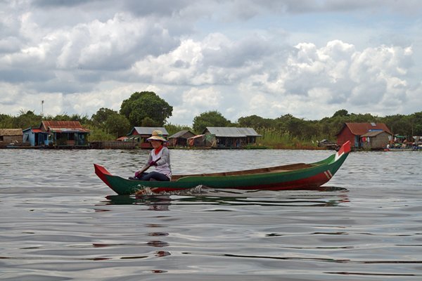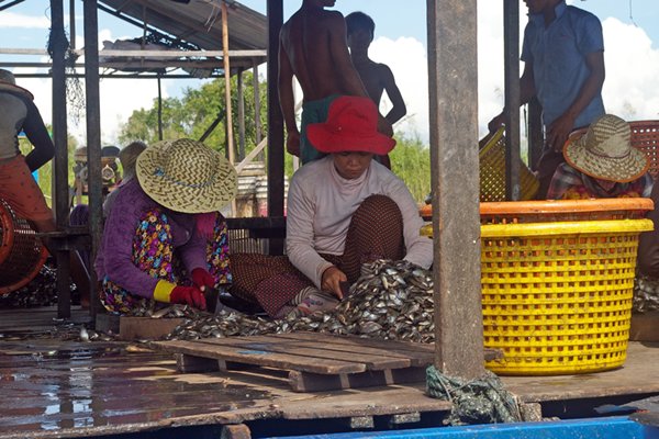 Als laatste zien we nog de activiteiten van het drijvende dorp van dichtbij. Omdat er niet het hele jaar vis is, hebben ze hier visfarms waarin ze vis opkweken, zodat ze het hele jaar door inkomen hebben. In een vrij kleine houten beschutting hangt een net dat van onderen met bamboestokken op zijn plaats wordt gehouden. Daarbinnen zijn twee bakken boordevol meervallen. In een maand of vijf worden ze van kleine visjes opgekweekt tot verkoopbare vis. Tussen de twee bakken in zit een man die ons een beetje simpel lijkt met een grote plastic ton vol kleine visjes die als voer voor de meervallen dienen. Als een automaat gooit hij beurtelings een paar visjes in de ene of de andere bak. De meervallen duiken er met z'n allen met veel spektakel op af. De man blijft zonder op of omkijken, uitdrukkingloos zijn monotone handeling herhalen.