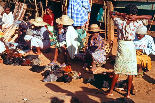 Voordat we vertrekken naar het Isola Park lopen we eerst nog wat door Ihosy. Marktkraampjes zijn niet opgesteld op een centraal plein of zoiets, maar staan langs de straten en steegjes in een gedeelte van de stad. Ook ambachtelijk werk wordt vaak voor de huizen uitgevoerd, zoals hier deze vrouw met een groot naaiwerk.
