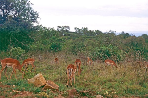 Om half zeven op pad naar het wildpark Hluhluwe-Umfalozi, drie kwartier rijden vanaf Kwambonambi. Acht volle uren in het park geweest. Alles is groen, er staan veel struiken en er is veel gras. Desondanks zien we veel beesten: giraffen, wildebeesten, impala's, nyala's (die we niet eerder gezien hebben), veel rhino's (minstens 30 witte neushoorns gezien), krokodil, trompetter hornbill (ook voor hier heel bijzonder), waterbucks, ijsvogels, buffels, wrattenzwijnen, roofvogels, bavianen. Niet gezien, wel aanwezig in het park: olifanten, leeuwen, cheetah's. Het is lekker rustig in het park en er zijn hier en daar picknickplaatsen met toilet.